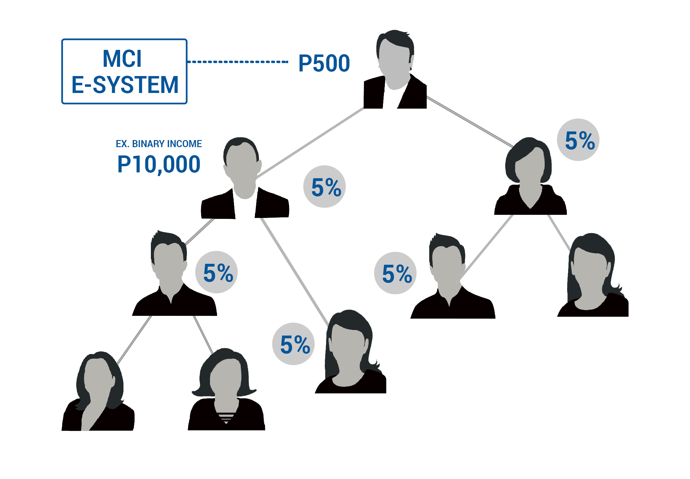 pass down of certain percentage income based on your sponsor up to the the 3rd level uplines’ binary bonus or cycle rewards, through the company MCI E-system